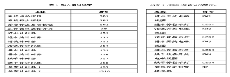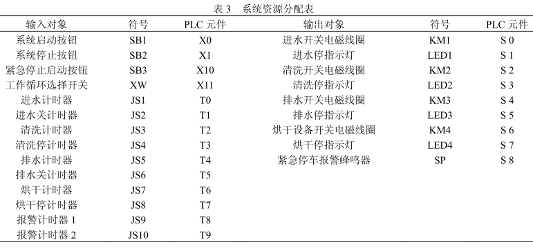 超聲波清洗器的輸入控制信號由點動按鈕提供, 通過PLC內部計時器提供計時功能從而提高控制系統的可靠性、精準度及靈敏度,從而實現整個清洗過程的全自動控制。輸入信號如表 1 所示: