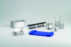 •珠寶機架或配備有鉤和由罐壁支撐小份持有者暫停在清洗液的部件。