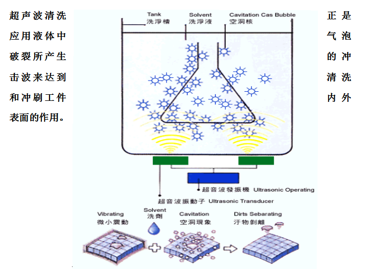 超聲波清洗機是利用高于20KHZ的超音頻信號,通過換能器轉換成高頻機械振蕩而傳入清洗液中,超聲波在清洗液中疏密相間地向前輻射,使液體流動并產生數以萬計的微小氣泡,這些氣泡是在超聲波縱向傳播形成的負壓區形成生長,而在正壓區迅速閉合,這些氣泡的形成生長及迅速閉合被稱為空化現象。在空化現象中,這些氣泡的閉合形成超過1000個大氣壓的瞬間高壓,連續不斷地瞬間高壓就象一連串小的“爆炸”不停地轟擊物體表面,使物體表面及縫隙之中的污垢迅速剝落,達到迅速清洗效果。 眾所周知,人們所聽到的聲音是頻率20~20000Hz的聲波信號,高于20000Hz的聲波稱之為超聲波,聲波的傳遞依照正弦曲線縱向傳播,即一層強一層弱,依次傳遞,當弱的聲波信號作用于液體中時,會對液體產生一定的負壓,使液體內形成許許多多微小的氣泡,而當強的聲波信號作用于液體時,則會對液體產生一定的正壓,因而,液體中形成的微小氣泡被壓碎。經研究證明:超聲波作用于液體中時,液體中每個氣泡的破裂會產生能量極大的沖擊波,相當于瞬間產生幾百度的高溫和高達上千個大氣壓,這種現象被稱之為“空化效應”,